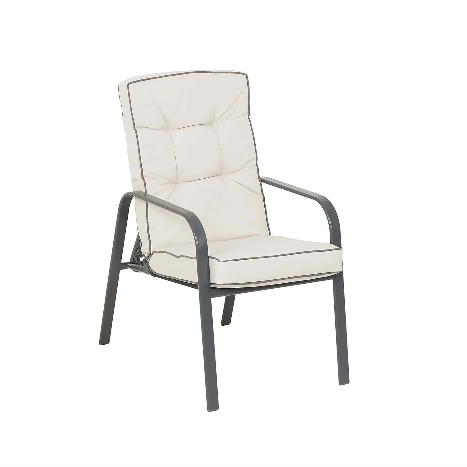 Relax and dine in comfort and style, the Rowly outdoor dining set makes al fresco entertaining a breeze. Whether haring a drink or hosting garden parties, this eight piece garden dining set is perfect for all of your special occasions. The stylish and modern design of this garden furniture set includes six inviting, reclining chairs with weather-resistant cushions so that your family and friends can truly relax and enjoy themselves, whilst the included parasol offers plenty of shade as it protects from the sun’s rays. The glass top table is not only beautiful, this stunning outdoor dining set will create a spectacular focal point of your garden.